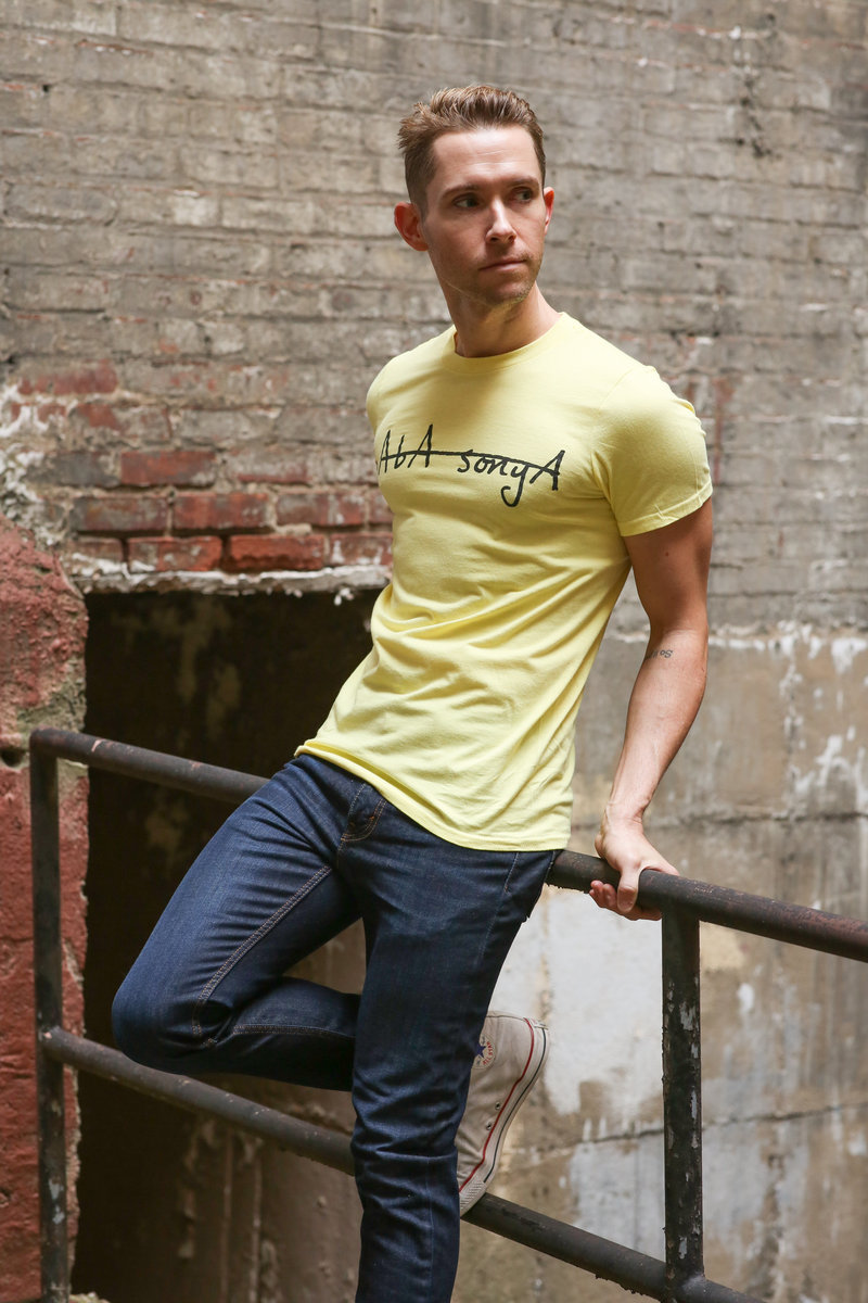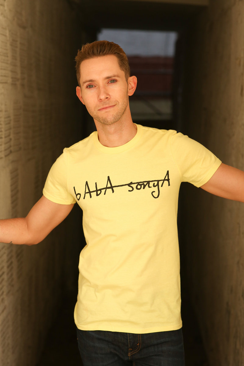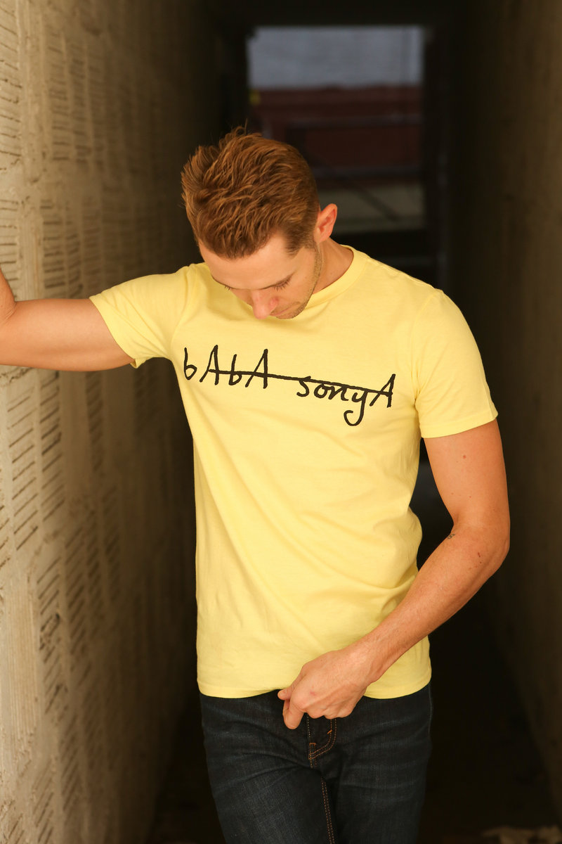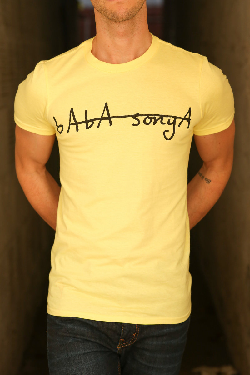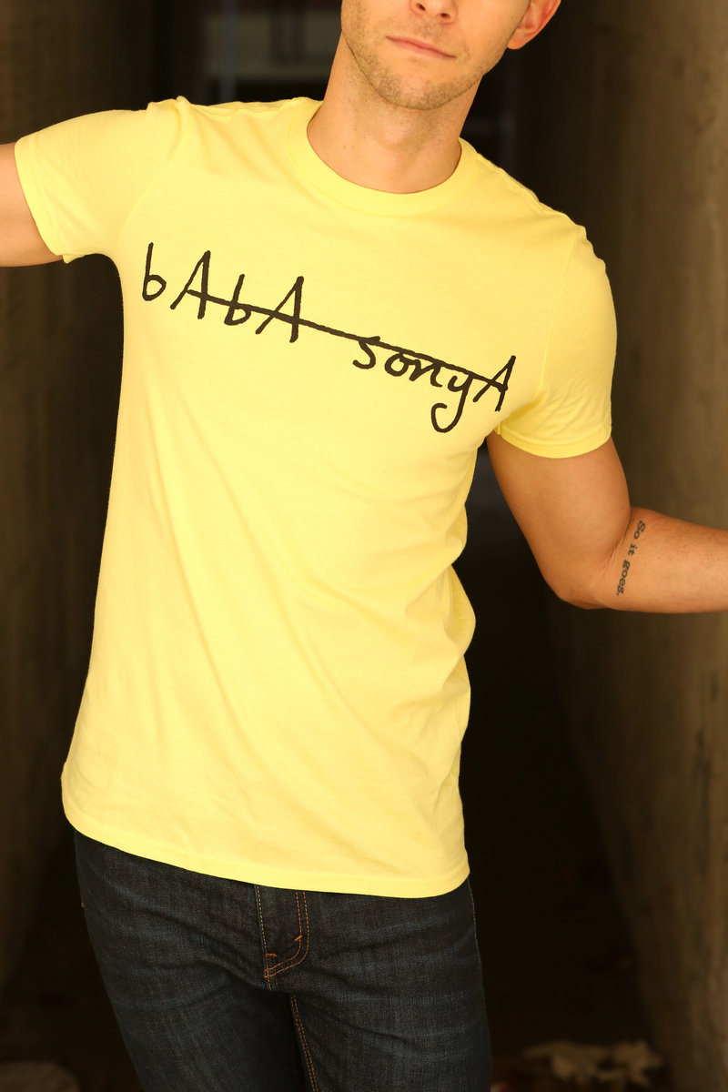 Lightweight ANVIL 100% cotton t-shirt with Baba Sonya logo in light yellow with black lettering. Logo artwork by Mike Costaney, photography by Tom Kordenbrock, modeling by Daniel Burns.